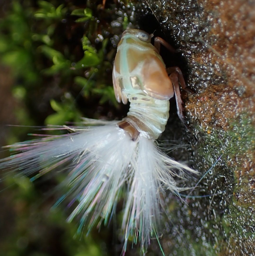 カメムシの仲間に多いのですが、体から蝋(ロウ)を出して硬い殻を作ったり(カイガラムシ)、泡で姿を隠したり(アワフキムシ)様々な使い方をしています。ハゴロモの幼虫もお尻からふさふさした蝋を出す種が多く、見た目にも面白い種がたくさんいます!