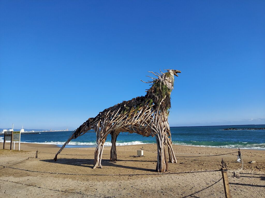 宿泊は湊線の終点、阿字ヶ浦にて。砂浜には奇妙なオブジェが立っていました。