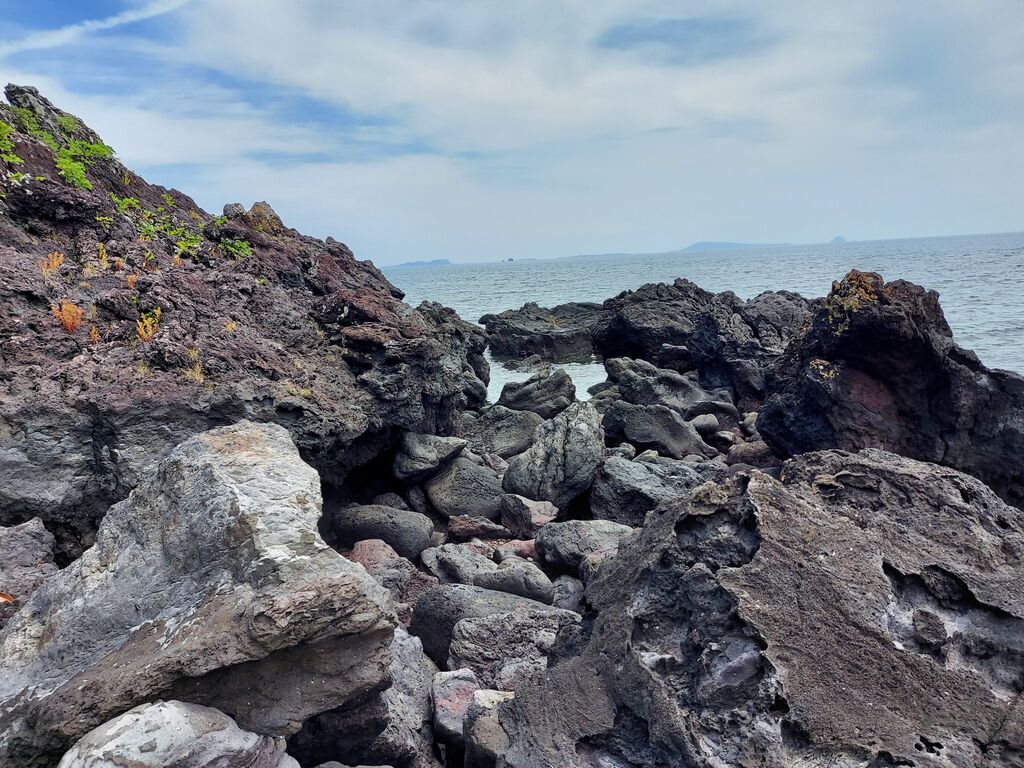 山から海へもすぐ行けます。こちらは鐙瀬(あぶんぜ)熔岩海岸、荒々しい火山由来の岩石が転がっております。鐙瀬とはまた難読な地名、鐙はアブミと読み馬に乗ったときに脚をかける器具のことを言うようです。フナムシがドン引きするほど大量におりました!