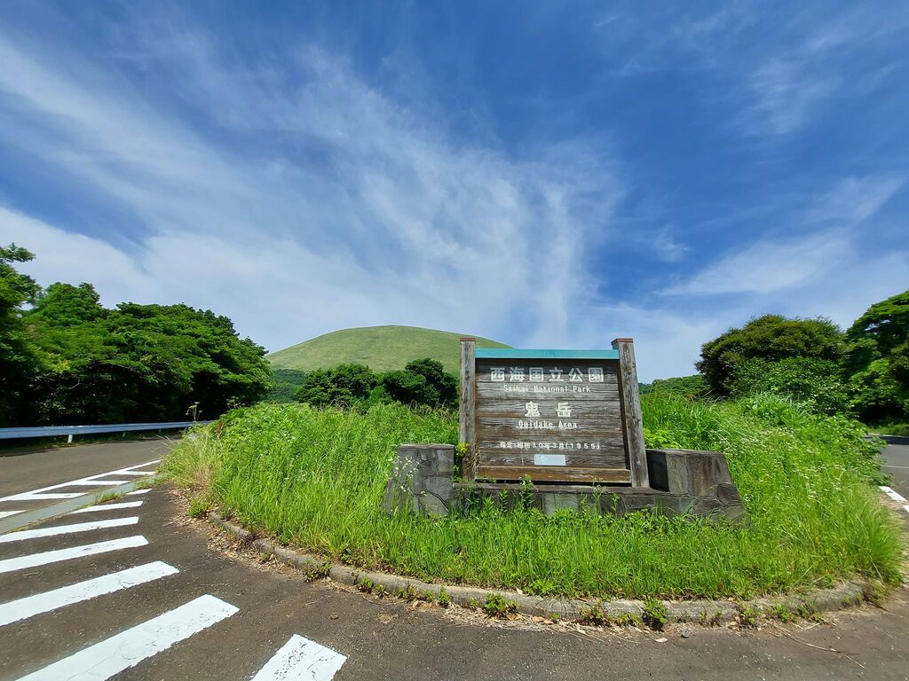 福江島には鬼岳という少し変わった山があります。看板の後方、遠くに見える薄い緑色の山なのですが樹が生えておらず草原が広がっております。
