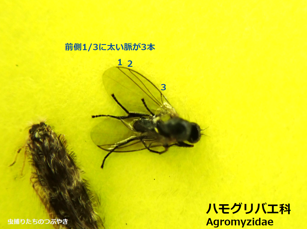 ハモグリバエ科の翅脈は、写真のように「太い脈が前縁に3つ詰まったように見える」という種類もいます。