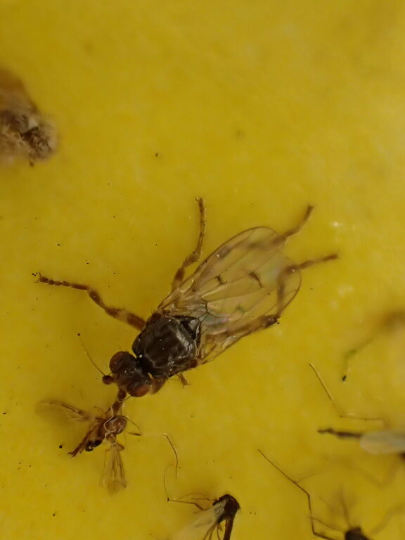 下の虫は後脚の腿節(ふともも)が太く発達し、翅脈(見えづらいですが)が大雑把で独特な形をしていることなどから「ノミバエ科」です。