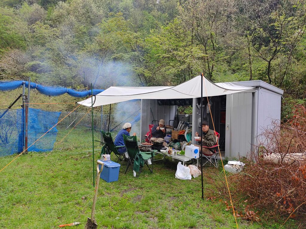 タープの下で鍋と肉を囲みます。春は何と言っても、山菜のシーズンですね!