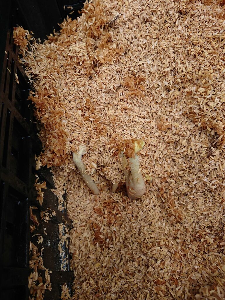 ウド発育の様子。籾殻で覆うことにより、白い可食部を多くしているんですね。